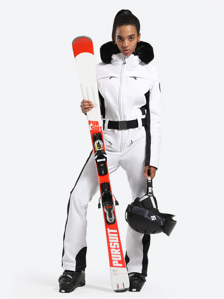 Women's Minimalist Faux Fur White & Black Down One-piece Ski Suits